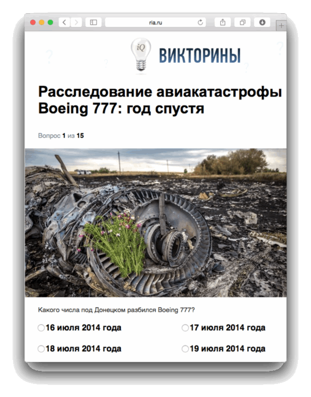 Российское информагентство РИА Новости устроило на своем сайте викторину под названием "Расследование авиакатастрофы Boeing 777: год спустя".