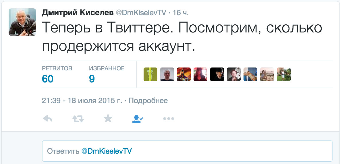 "Теперь в Твиттере. Посмотрим, сколько продержится аккаунт", - написал Киселев.