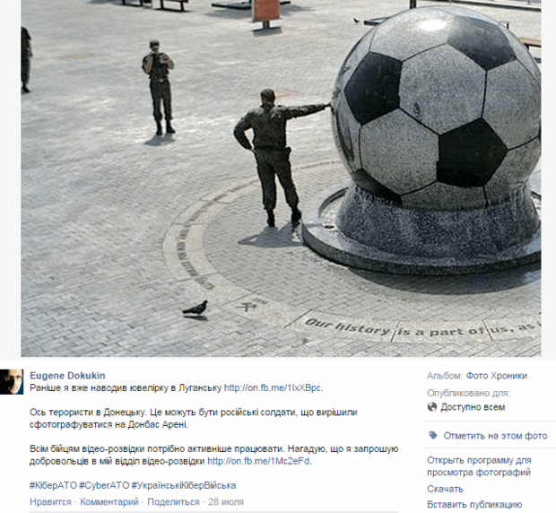 "Вот террористы в Донецке. Это могут быть российские солдаты, которые решили сфотографироваться на "Донбасс Арене" (у них другая форма, чем у террористов), - написал Докукин.