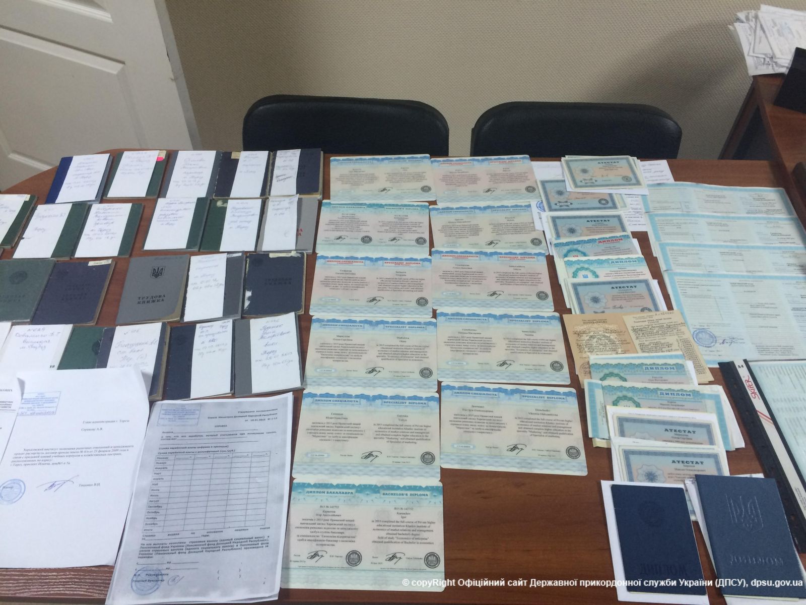 Пограничники совместно с сотрудниками таможни провели досмотр личных вещей, среди которых нашли около 20 трудовых книжек, 14 дипломов о высшем образовании Харьковского частного института и 9 чистых бланков справок «ДНР» для начисления пенсий с проставленными мастичными печатями.