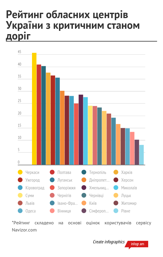 По данным сайта Navizor.com был составлен рейтинг крупнейших городов Украины с наихудшей качеством дорог. Благодаря независимым оценкам автомобилистов и неравнодушных граждан, удалось собрать объективную информацию о реальном состоянии дорог в областных центрах Украины.