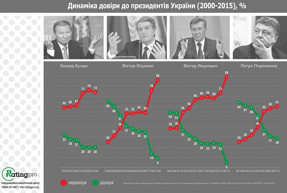 Если в случае Кучмы, Ющенко и Януковича речь шла о нескольких годах или же полном президентском сроке, то в случае Петра Порошенко — это чуть больше года. За это время уровень недоверия к нему увеличился с 25% до 61%. Доверие снизилось с 64% до 28%.