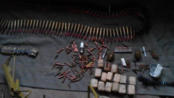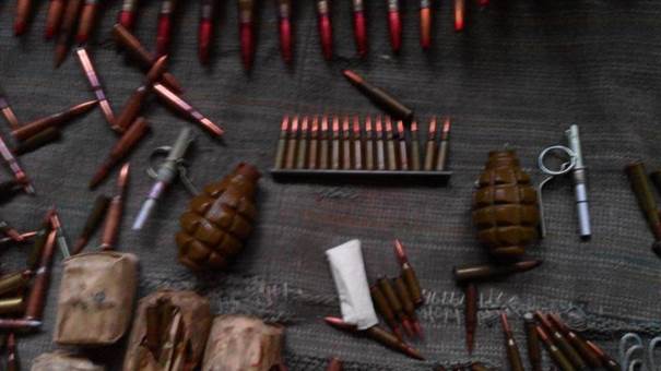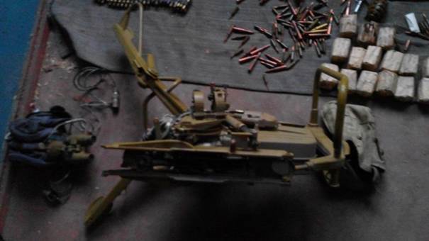 "Из тайника изъята боевая разведывательно-дозорная машина, два прибора наведения для гаубиц, большое количество патронов различных калибров, две гранаты Ф-1, 12 магазинов к РПК, подставка для АГС, шесть приборов наведения к РПГ-7, 67 бронежилетов, 42 кевларовые каски, 21 портативную цифровую радиостанцию", - говорится в сообщении.