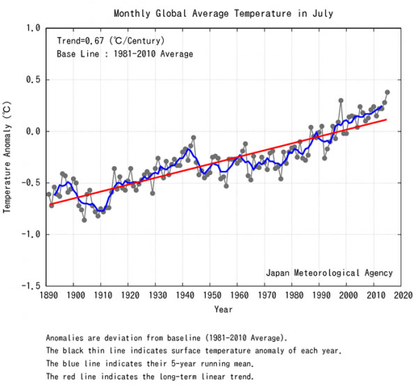Японское метеорологическое агентство подтверждает эту информацию, хотя им и используются другие методы для наблюдений. На графике ниже показана среднемесячная температура в июле за 1890-2015 годы: