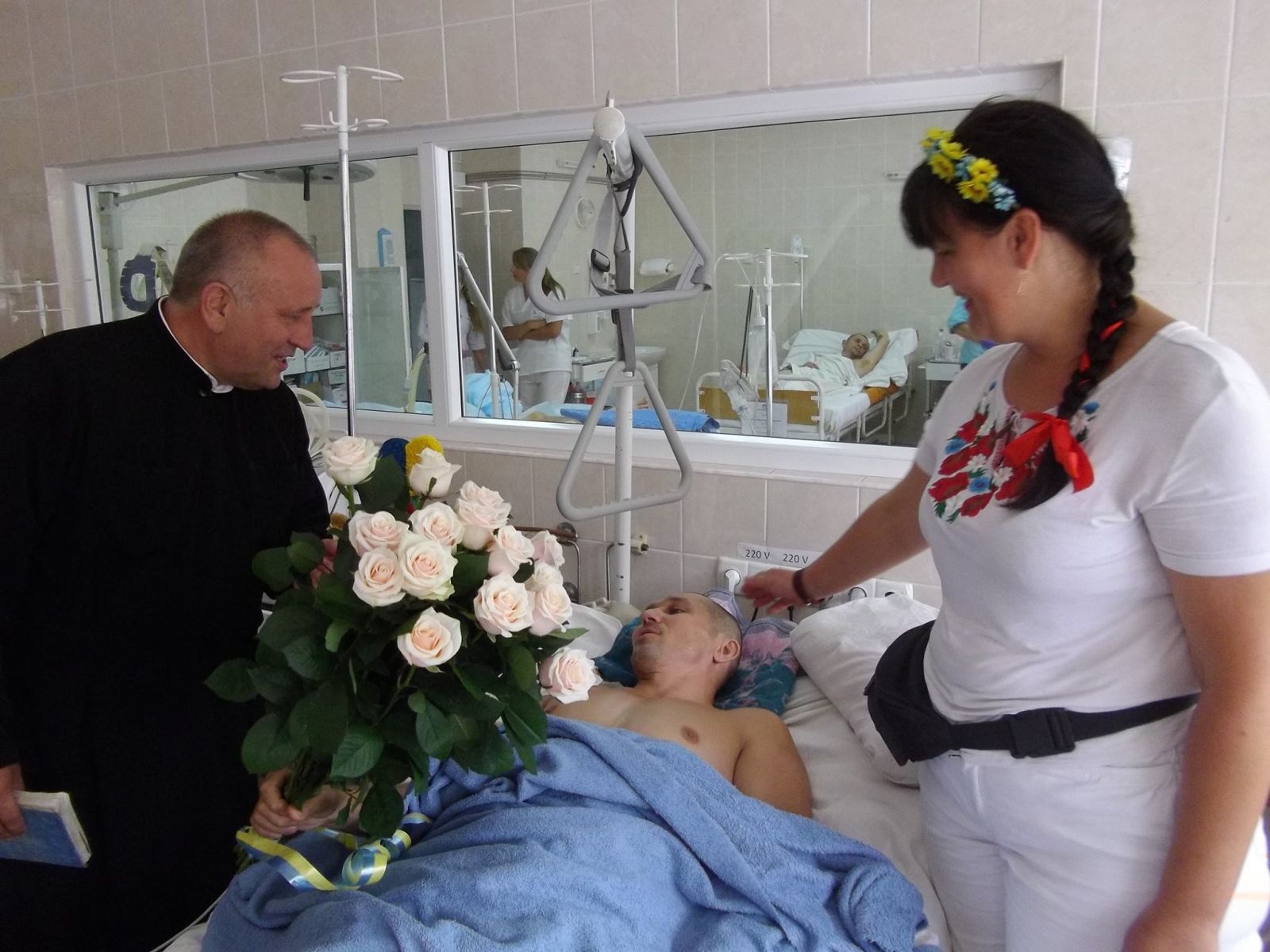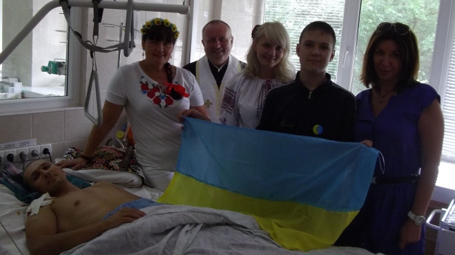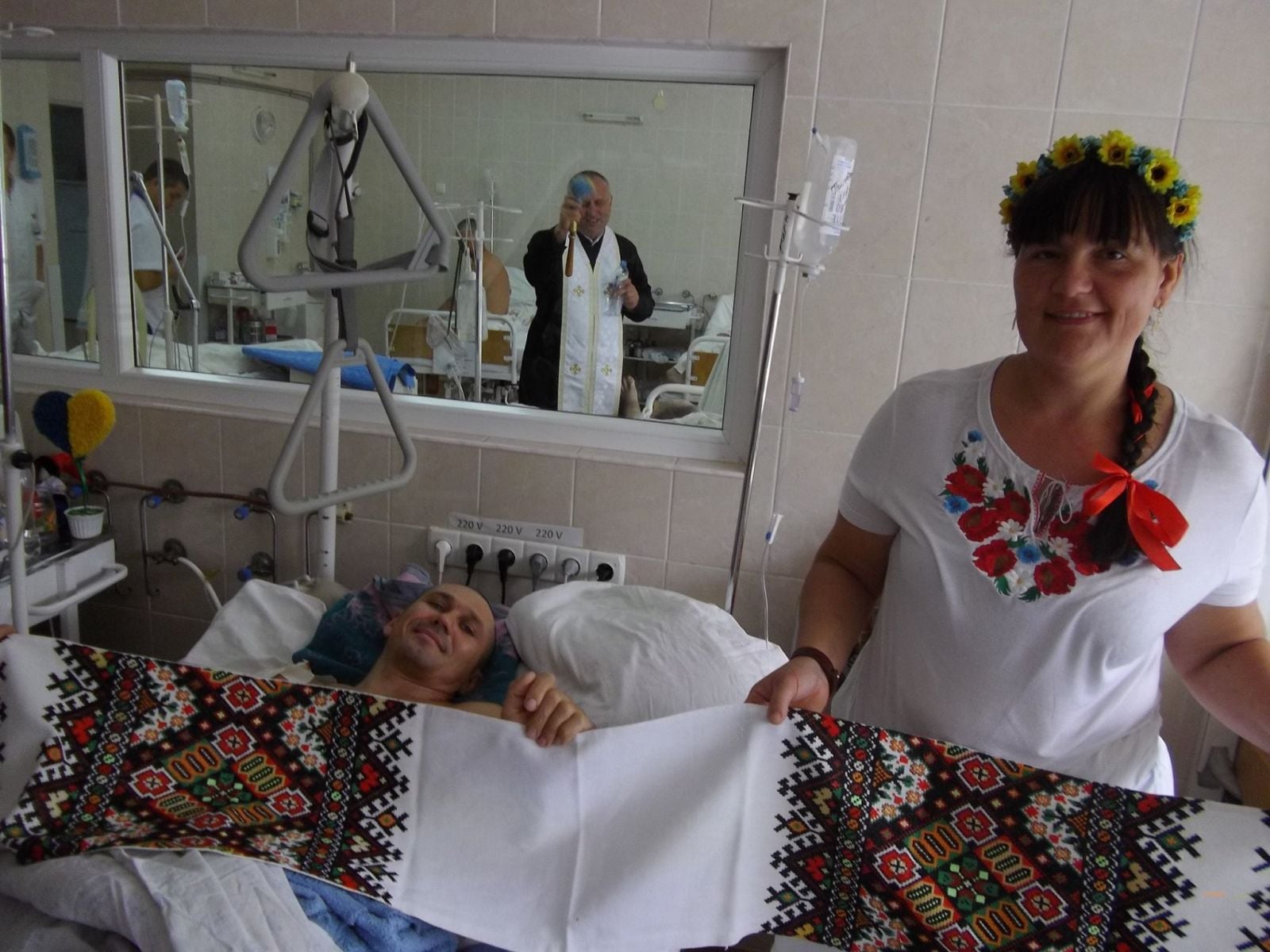 Запорожец Алексей Грищенко, получивший тяжелые ранения в зоне проведения АТО, на данный момент находится в реанимационном отделении. Вчера Алексей Грищенко вместе со своей женой Надеждой обвенчались. В реанимацию был приглашен Отец Петр, который и обвенчал молодых.