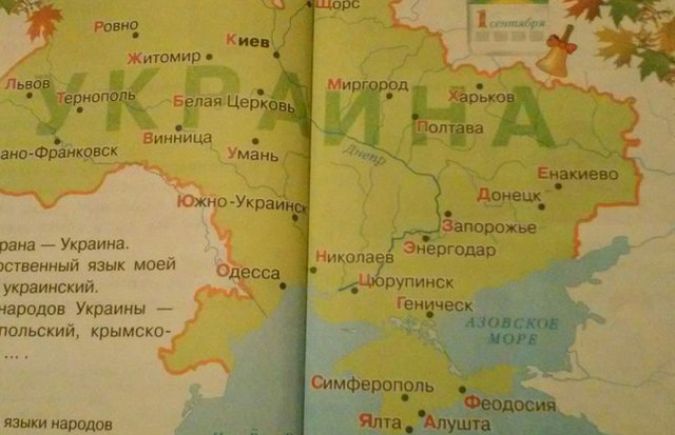 Херсонским первоклашкам раздали русскоязычные буквари, на которых нет Херсона. Днепропетровска, Черкасс, Черновцов и Луганска. Зато на карте поместились Енакиево, Геническ и Цюрупинск.