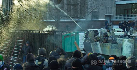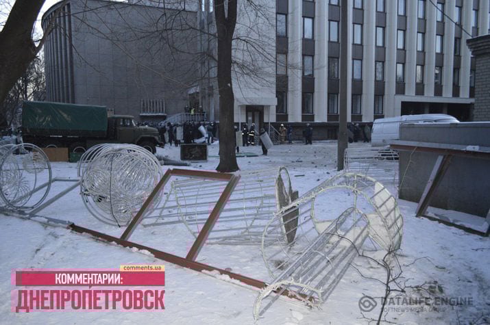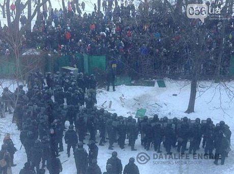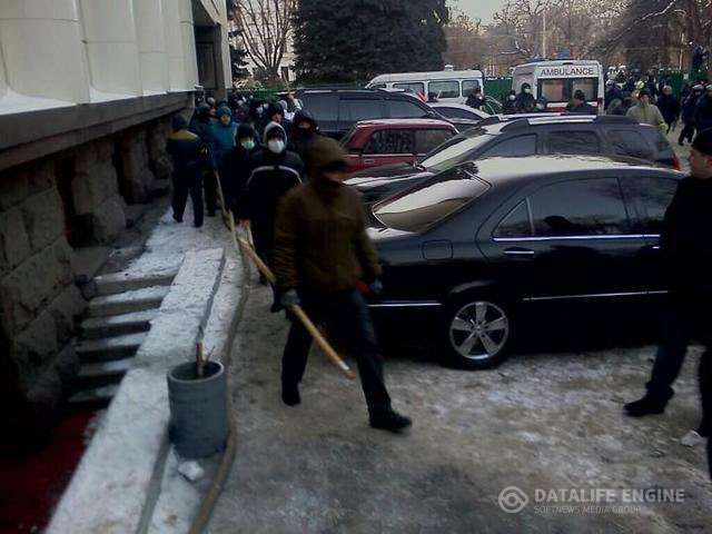Митингующие с криками «Банду геть!», «Зека геть!» (имея в виду тогдашнего президента с тёмным уголовным прошлым) потеснили милицию и со стороны проспекта Пушкина и сквера им. Ленина сломали часть ограждения вокруг здания ОГА. Пролом закрыли сотрудники милиции и «Беркута». Около 10 милиционеров построились черепахой у входа в ОГА. Люди продолжали попытки пробиться к зданию. Правоохранители ответили струёй ледяной воды из пожарного гидранта.