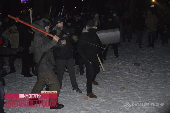 Затем правоохранители расступились, дав части титушек (около 60 человек) выйти из-за забора, и те стали забрасывать пикетчиков дымовыми шашками, камнями, пиротехникой и палками, стрелять по людям из травматического оружия, активно провоцируя их на ответные действия. В результате пострадал оператор телеканала ICTV: ему разбили камеру и нанесли травму, попав камнем в шею. Похожее произошло и с журналистами 34-го канала.