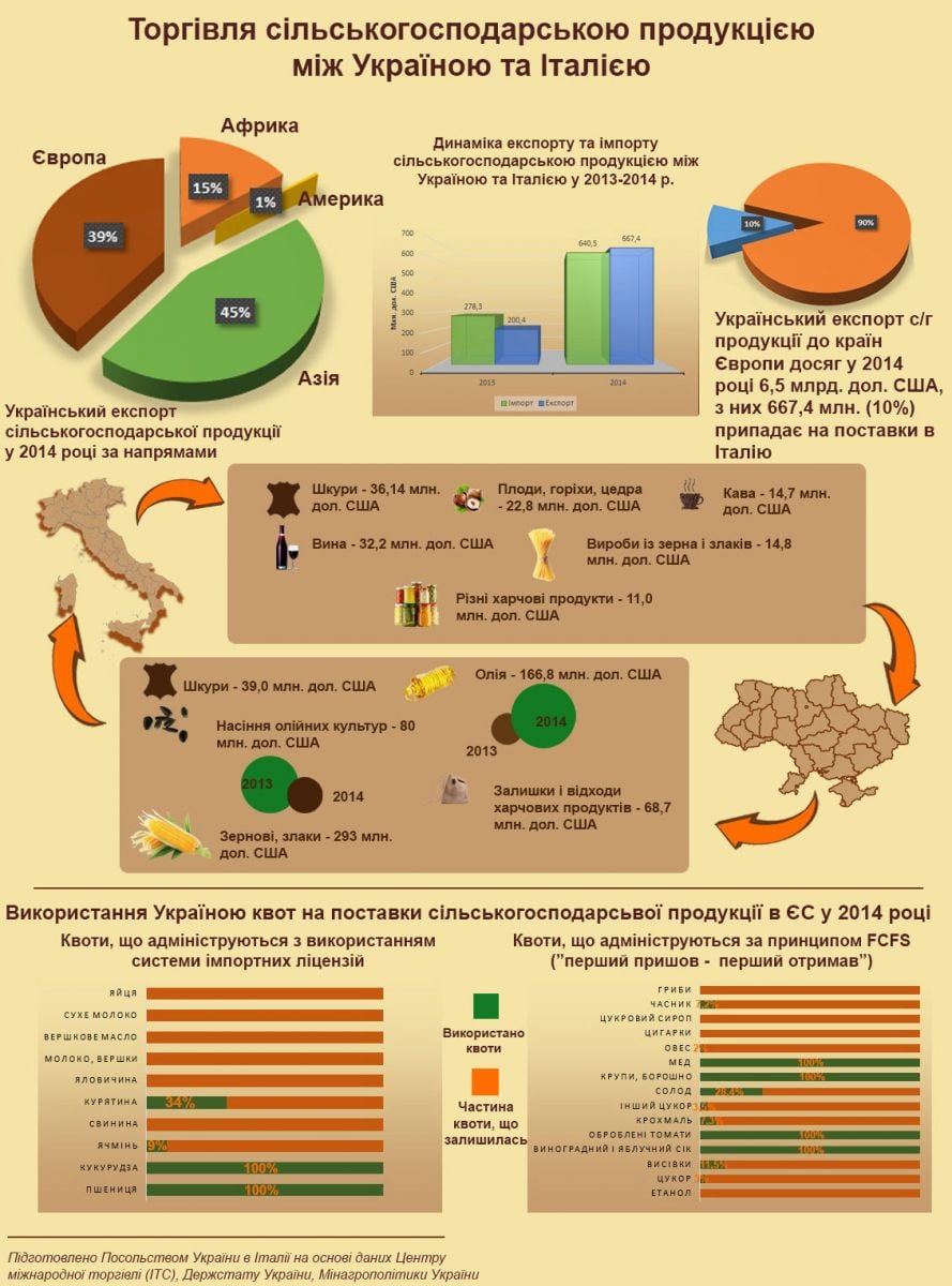 По итогам 2014 года украинские аграрии экспортировали в Италию товаров на $667 млн, что составляет 10% от всего украинского аграрного экспорта в ЕС.