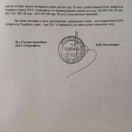 "Учитывая встречность, однородность обязательств (требований) и наступление срока их выполнения, "Укрнафта" заявляет о зачислении своих обязательств по уплате "Нафтогазу" дивидендов за 2014 год в общей сумме 632,304 млн гривен в счет обязательств НАКа перед "Укрнафтой" по возмещению вреда, причиненного безосновательным использованием имущества - природного газа в объеме 123 242,634 тысяч куб. м на сумму 632 304,449 тысяч гривен", - говорится в письме.