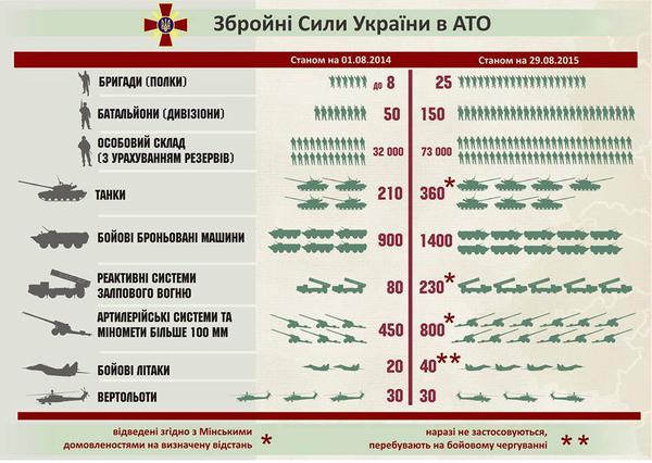 Министерство обороны Украины опубликовало инфографику, на которой видно, как укрепилась наша армия за год по сравнению с августом 2014-го. Наблюдается увеличение личного состава и вооружений практически по всем позициям, за исключением вертолетов.