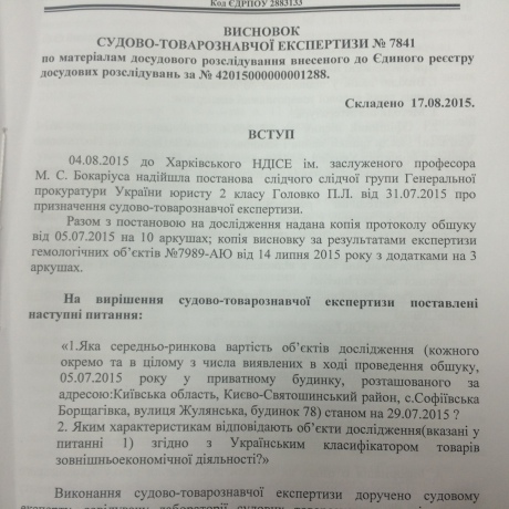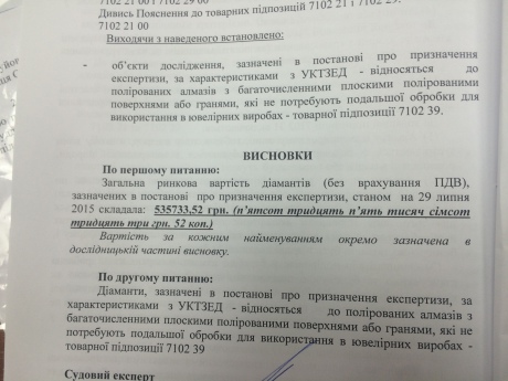 "Общая рыночная стоимость бриллиантов (без учета НДС), указанных в постановлении о назначении экспертизы, по состоянию на 29 июля 2015 года составляла 535 733,52 грн", - говорится в документе.