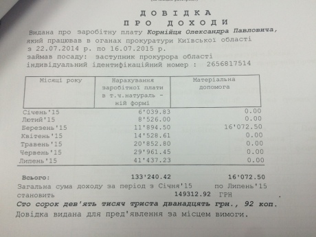 При этом заработная плата Корнийца в течение 2014-2015 годов составляла 133 тысячи 240 гривен.