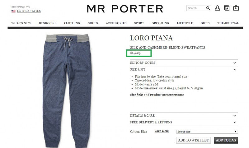 Тренировочные штаны компании Loro Piana в принципе отличаются высокой стоимостью - многие из ее коллекций стоят 1000 долларов и выше.
