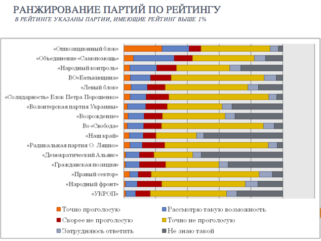 Если остановиться на партиях, которые имеют самый высокий антирейтинг, то это, прежде всего, партии известные. Так, ВО «Свобода» имеет антирейтинг 64%, при этом 75,3% не проголосуют или скорее не проголосуют за партию, хотя 94,6% эту партию знают.