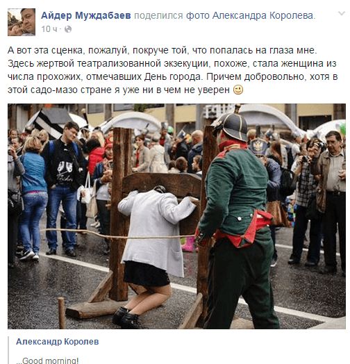 «А вот эта сценка, пожалуй, покруче той, что попалась на глаза мне. Здесь жертвой театрализованной экзекуции, похоже, стала женщина из числа прохожих, отмечавших День города. Причем добровольно, хотя в этой садо-мазо стране я уже ни в чем не уверен», - прокомментировал журналист.