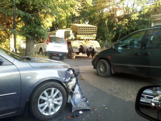 В центре Симферополя образовался затор на улице Гоголя в результате столкновения реактивной системы залпового огня БМ-21 "Град" с автомобилем Mazda 3.