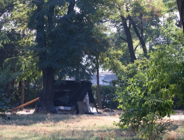 Между деревьями стоит десяток шатров, в которых живут неизвестные люди, причем целыми семьями, включая детей дошкольного возраста.