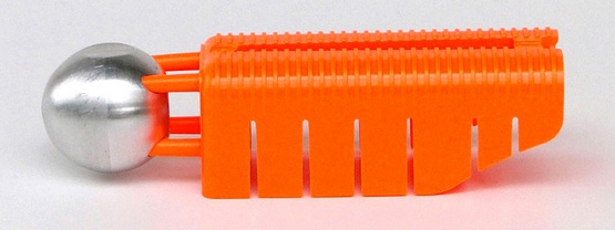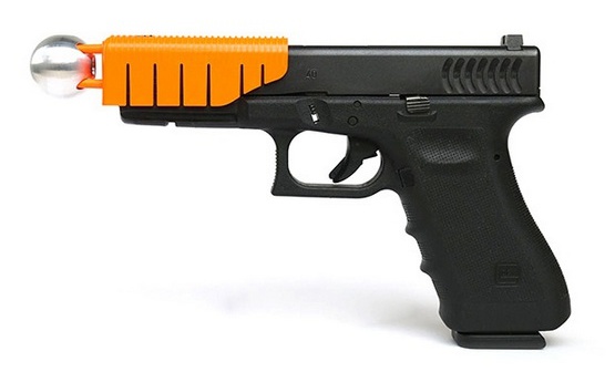 Новое устройство Alternative Ballistics – это легко монтируемый на большинство стандартных пистолетов наствольный замедлитель. Он состоит из пластиковой защелки, надеваемой на пистолет со стороны ствола, и стального шарика с отверстием в центре, стоящего сразу за урезом ствола. Когда штатная пуля пистолета покидает ствол, она заполняет собой отверстие в шарике и продолжает полет уже вместе с шариком.