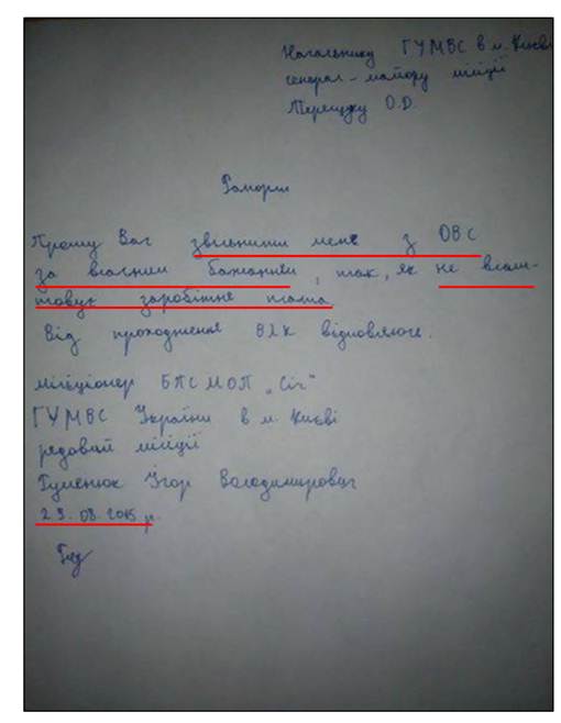 Наступного дня після цих приватних розмов 28.08.2015 обидва підозрювані у вчиненні терористичного акту виїхали до міста Києва. Один із них - Особа 1 - у суботу 29 серпня написав рапорт на звільнення з органів внутрішніх справ, за власним бажанням, мотивуючи це рішення низьким рівнем заробітної платні. Так само вчинили ще декілька бійців батальйону міліції «Січ». Прошу показати слайд № 2 – це рапорт Особи 1. Наскільки пов`язані ці зустрічі керівництва ВО «Свобода» із залученням конкретних осіб до вчинення теракту – буде перевірено у ході слідства.