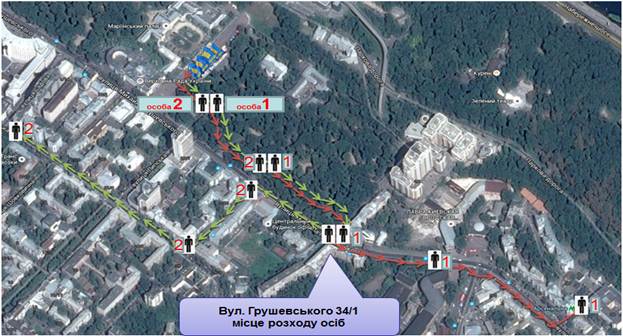 Встановлено, що після перевдягання Особа 1 зустрівся з Особою 2 біля пам’ятнику генералу Ватутіну. Разом вони вийшли з Маріїнського парку, підійшли до магазину «Чумацький шлях», перейшли вулицю М. Грушевського, біля будинку № 34/1 пересвідчилися в тому, що їх ніхто не переслідує та розійшлися. Особа 1 самостійно пішов до метро Арсенальна, де був затриманий працівниками міліції. Особа 2 отримав телефонний дзвінок від Особи 3, пройшов через Кріпосний провулок на вулицю Інститутську і спустився на Майдан Незалежності. Там він був затриманий із засобами маскування обличчя та димовими шашками аналогічними тим, що використовувалися під час маскування вчинення терористичного акту.