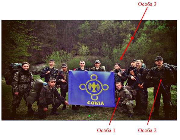 На цьому слайді ми бачимо підозрюваних Особу 1, Особу 2 та Особу 3 разом із символікою ВГО «Сокіл».