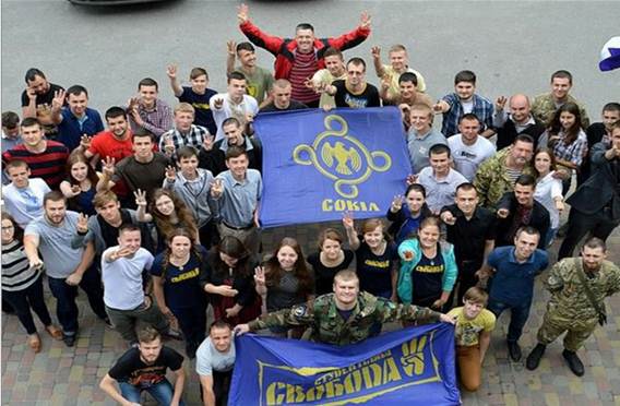 На цьому слайді ми бачимо групу активістів із символікою ВГО «Сокіл» та ВО «Свобода»