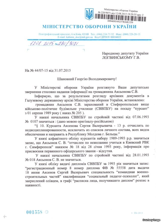 Информация об окончании российским главой Крыма Сергеем Аксеновым Симферопольского высшего военно-политического строительного училища, указанная в его официальной биографии, не соответствует действительности. Об этом сообщается в ответе министра обороны Украины Степана Полторака на запрос народного депутата Георгия Логвинского. Копия этого документа находится в распоряжении Крым.Реалии.