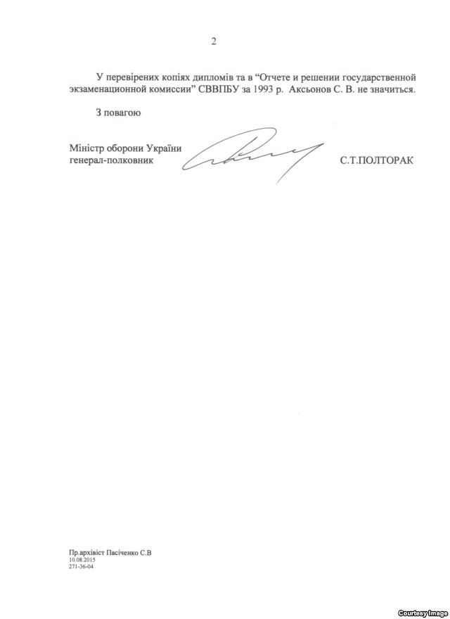 По данным украинского министерства, была проведена проверка архивных документов и выяснилось, что в июне 1993 года Аксенова отчислили из училища за недисциплинированность.