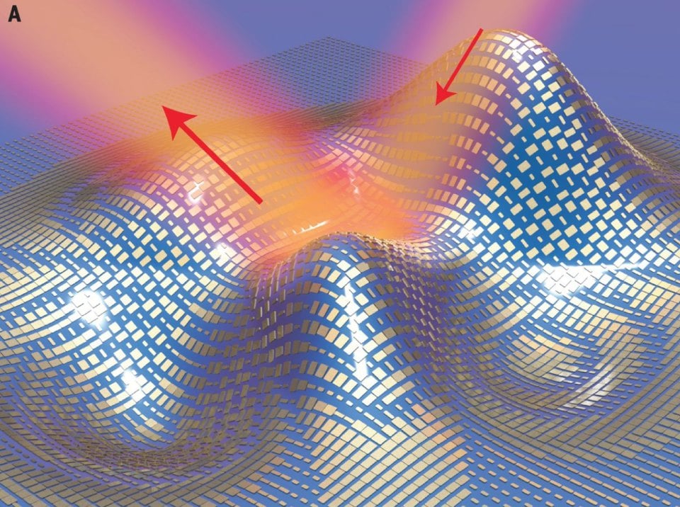 Ученые создали материал из так называемых наноантенн — наночастиц золота заданного размера — которые не рассеивают падающий на них свет, а перенаправляют его. Упрощая, можно сказать, что антенны выстраиваются в конвейер, каждая из них получает и передает световую волну дальше — в итоге материал отражает падающий на него луч, одновременно сохраняя фазу света определенной длины. В результате тончайшая пленка из наноматериала скрывает трехмерный объект.