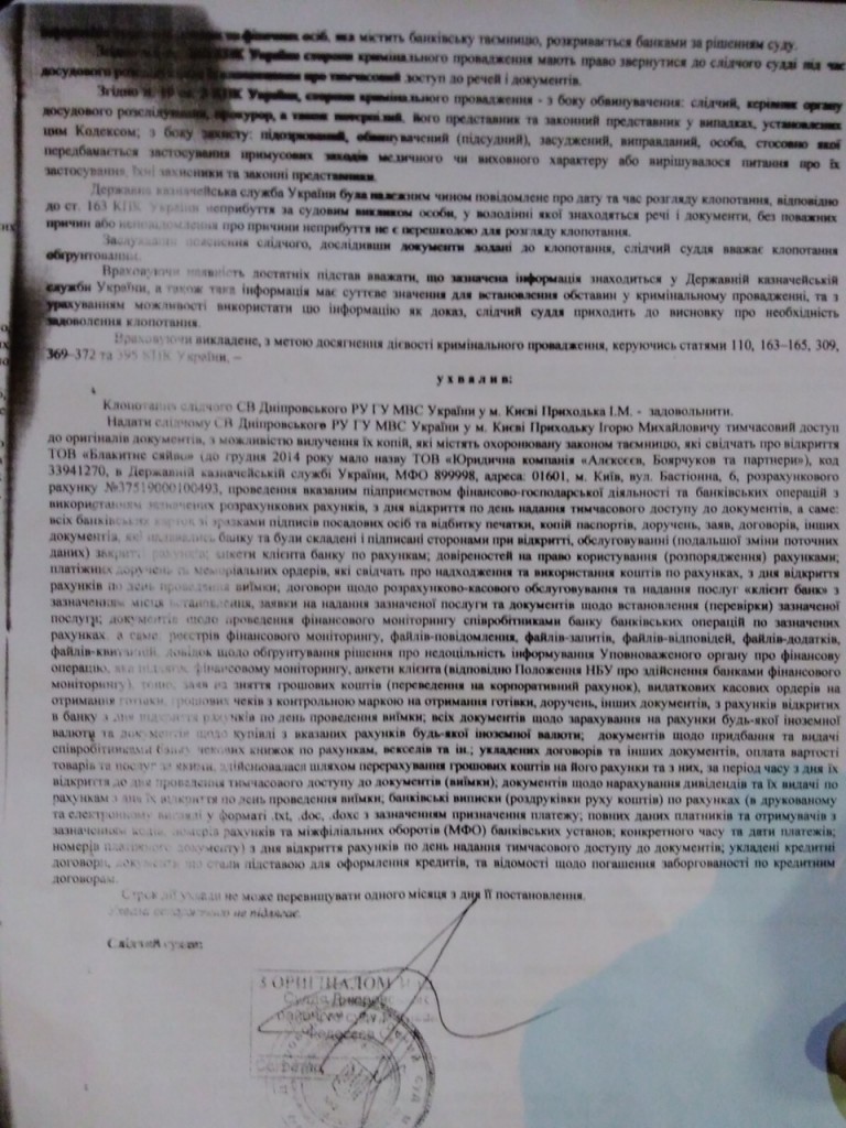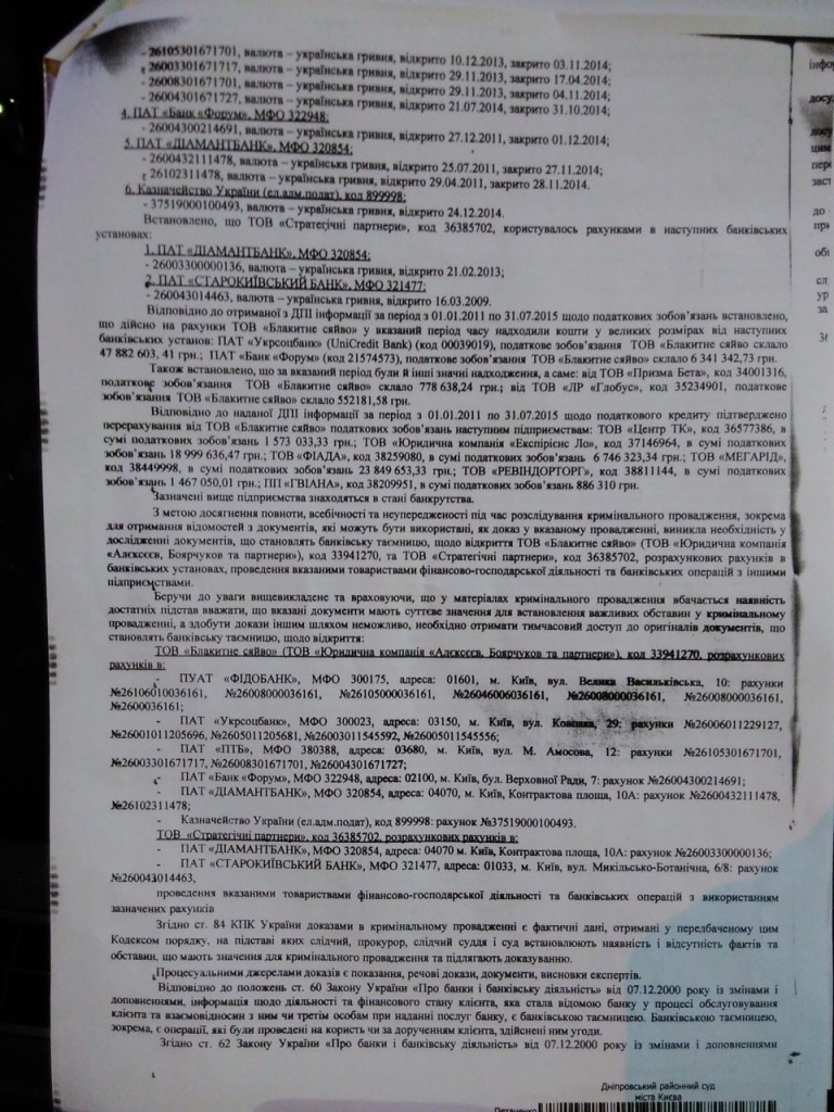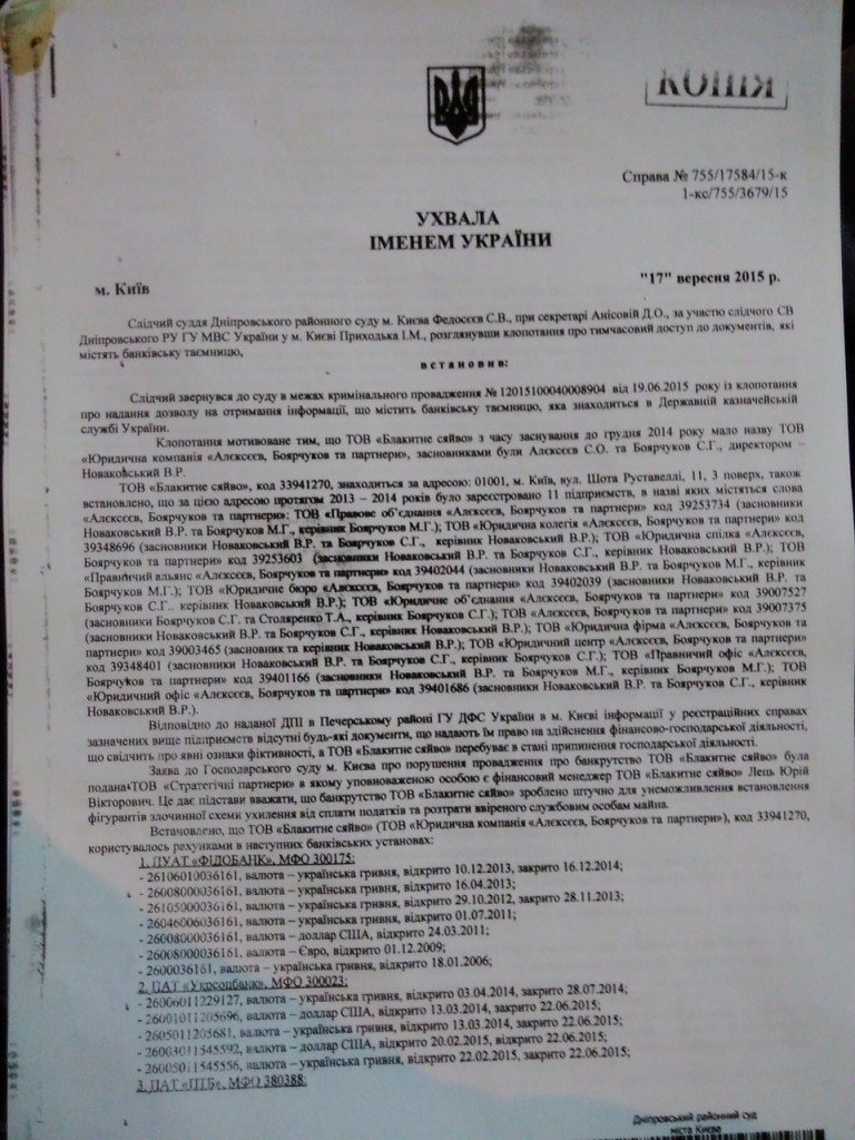 Как стало известно, Днепровский районный суд сегодня вынес решение относительно предоставления разрешения на получение информации содержащей банковскую тайну, относительно криминальной деятельности ООО «Голубое Сияние» (до изменения названия: Алексеев, Боярчуков и партнеры), одним из владельцев и основателей которого является скандально известный депутат Блока Петра Порошенко Сергей Алексеев, пишет Элита страны.