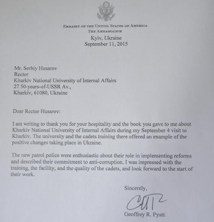 В письме к ректору Харьковского национального университета внутренних дел Сергею Гусарову Чрезвычайный и полномочный Посол США в Украине Джеффри Пайетт поблагодарил за гостеприимство и отметил, что университет и его слушатели является примером положительных изменений, которые происходят в Украине. Он подчеркнул, что во время своего визита в Харьков 4 сентября, был поражен учебным процессом и уровнем профессиональной подготовки новых патрульных полицейских.