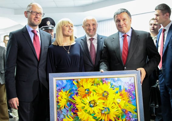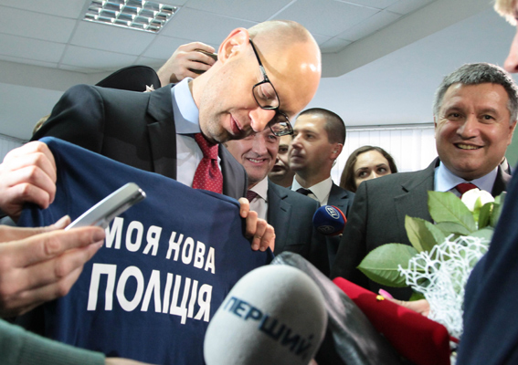 В рамках церемонии открытия набора в новую полицию Полтавы Премьер-министр Украины Арсений Яценюк и глава МВД Арсен Аваков вручили полтавской художнице Юлии Сторожук наручные часы с символикой МВД и футболку с надписью «Моя новая полиция».