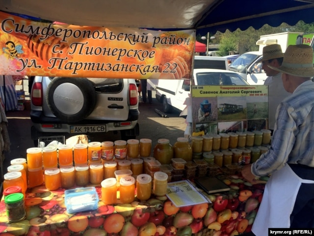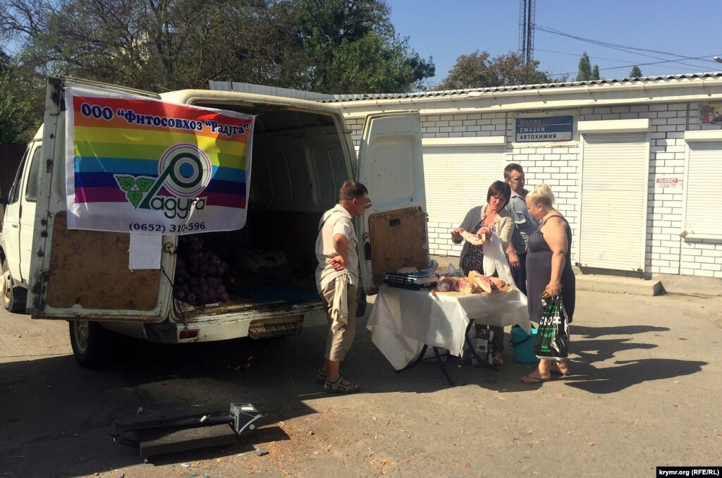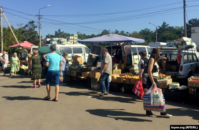 На прилавках по-прежнему можно встретить товары с материковой Украины – преимущественно крупы и овощи. Посетители, которых, несмотря на выходной день, на ярмарке не так много, интересуются происхождением продуктов.