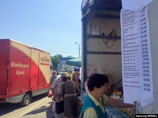 Он считает, что уже в скором времени из-за блокады Крыма начнутся проблемы с продовольствием. А утверждение, что большинство продуктов на полуострове, как заверяют власти Крыма, свои или привозят с материковой России, продавец подверг сомнению.