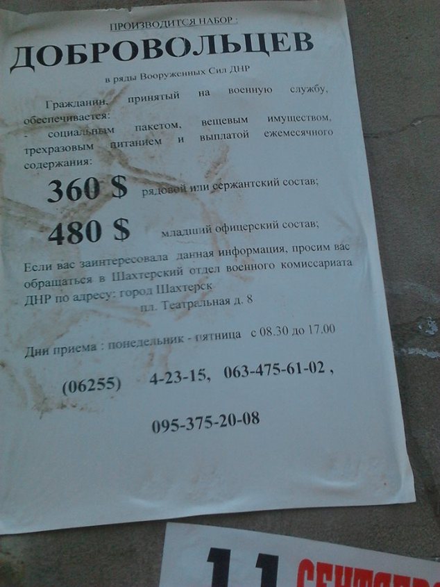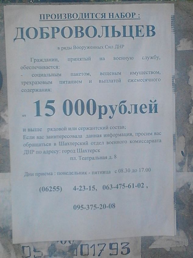 Сначала добровольцам обещали от $360 зарплаты, соцпакет, обеспечение вещевым имуществом, трехразовое питание. Сейчас же желающим повоевать на стороне боевиков предлагают 15 тыс. рублей, что составляет приблизительно $200.