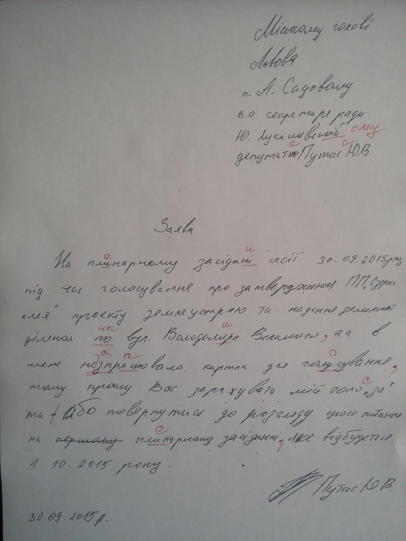 Депутат Львовского Горсовета Юрий Путас допустил сразу 16 ошибок в заявлении, адресованному мэру города Андрею Садовому.