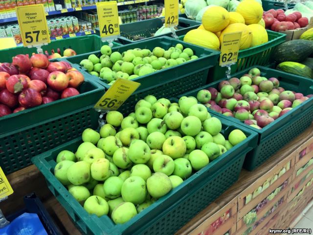 В сети супермаркетов цены на продукты также выросли. К примеру, в одном из симферопольских «Фуршетов» баклажаны стоят 64 рубля за кг, болгарский перец почти 50 рублей. В сети ПУД яблоки предлагают от 42 до 62 рублей, картофель – 33 рубля, причем, если верить надписи на ценнике, указанные фрукты и овощи были привезены с материковой Украины.
