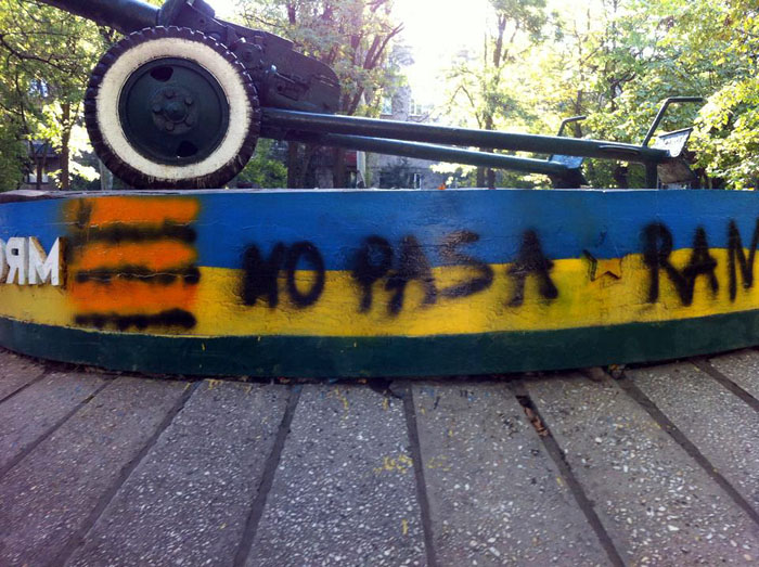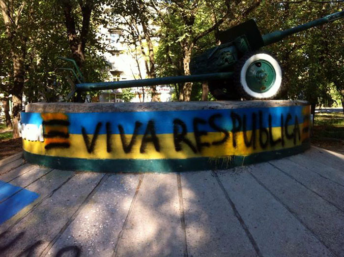 Сторонники «ДНР» разрисовали памятник, установленный в честь 30-летия освобождения Краматорска от немецко-фашистских захватчиков, «колорадской» символикой и надписями «Viva Respublika» и «No pasaran».