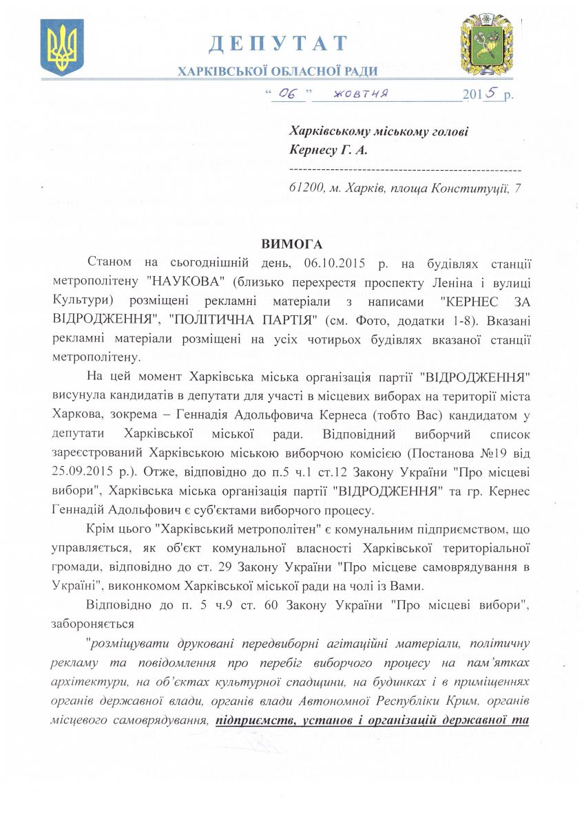 1. Негайно припинити з Вашого боку як кандидата в депутати та діючого міського голови, а також відповідних комунальних підприємств міста, порушення виборчого законодавства (п. п. 5, 6 ч.9 ст. 60 Закону України "Про місцеві вибори") та зловживання майном територіальної громади, а саме - припинити використання будівель станцій Харківського метрополітену для власної політичної реклами.
