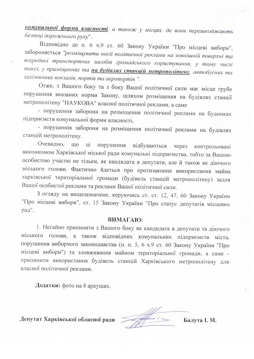 Очевидно, що ці порушення відбуваються через контрольовані виконкомом Харківської міської ради комунальні підприємства, тобто за Вашою особистою участю не тільки, як кандидата в депутати, але й також як діючого міського голови. Фактично йдеться про протизаконне використання майна харківської територіальної громади (будівель станцій метрополітену) задля Вашої особистої реклами та реклами Вашої політичної сили.