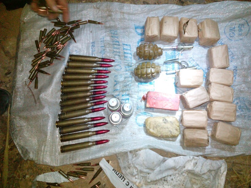 Как сообщает пресс-центр СБУ, на расстоянии 500 метров от железнодорожной станции из схрона изъяты пластид, тротиловые шашки, гранаты для подствольного гранатомета, гранаты Ф-1 с запалами, большое количество патронов калибра 5,45 и 14,5 мм.