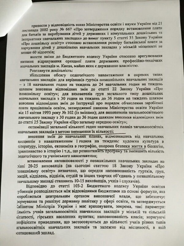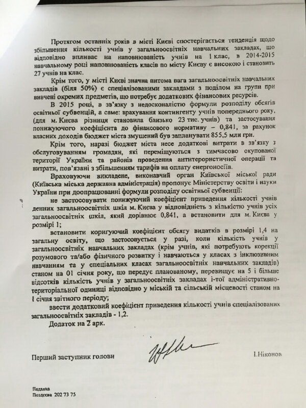 Согласно документам за подписью первого замглавы КГГА Игоря Никонова, столичные власти настаивают на необходимости увеличения для учителей и воспитателей Киева объема учебных часов на неделю, а также предлагают МОНу отказаться от создания групп в классах при изучении некоторых предметов, в частности, украинского языка.