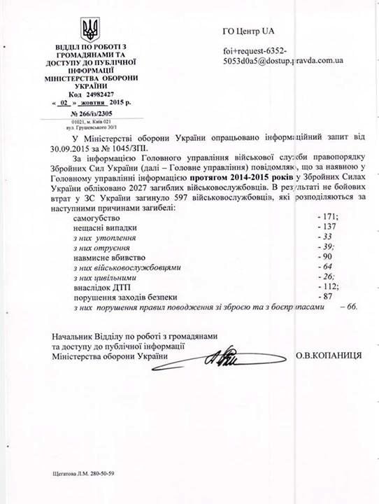 По информации Главного управления военной службы правопорядка Вооруженных Сил Украины, количество небоевых потерь за период 2014-2015 годы составляет 597 военнослужащих: