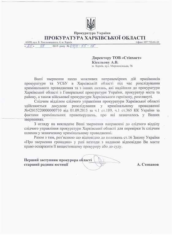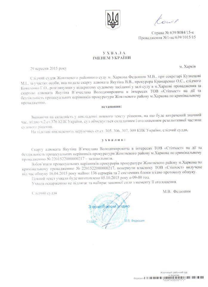Согласно решению суда, процессуальных руководителей прокуратуры Октябрьского района Харькова обязали вернуть владельцу "СтипХост" изъятое во время обысков оборудование - 136 серверов и два системных блока, отмечает SQ,