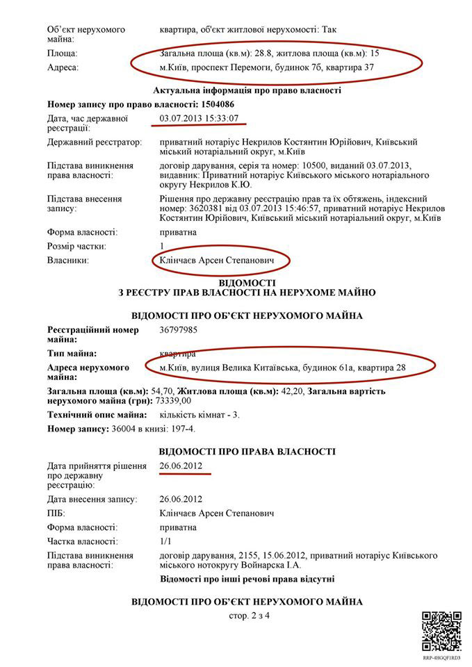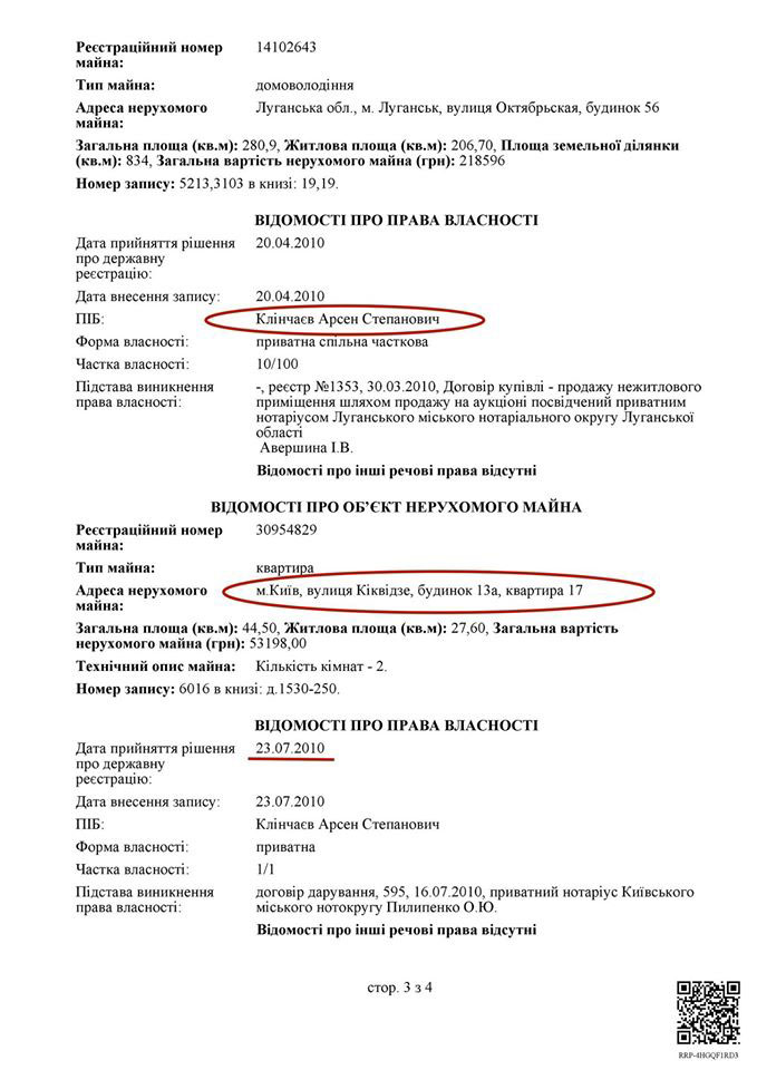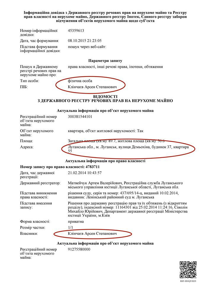 "Пока большая часть из тех самых 1,5 млн донбасских беженцев, о которых говорил Президент Порошенко, живёт как получится и где придётся, человек, который фактически руководил захватом Луганской ОГА, оказывается, имеет в Киеве 3 (три) квартиры: на проспекте Победы 7б/37, на Большой Китаевской, 61а/28 и на Киквидзе, 13а/17. Этого человека зовут Арсен Клинчаев и уже полтора года наше государство не может осудить его за очевидное преступление", - написал журналист.