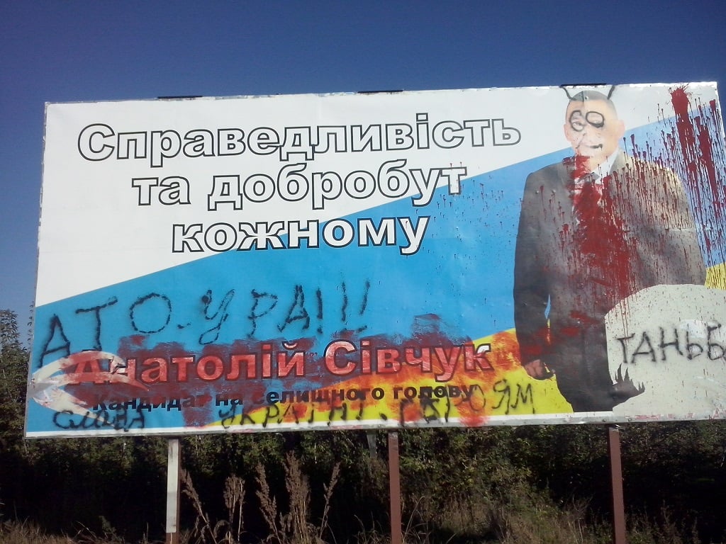 За інформацією спостерігачів, білборд кандидата, розміщений при в’їзді у Підволочиськ, залили червоно фарбою. Також на ньому написали слова “Ганьба!” та “АТО – УРА!”.