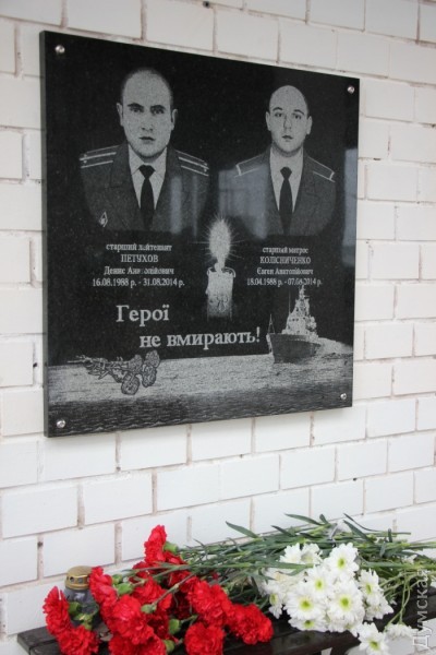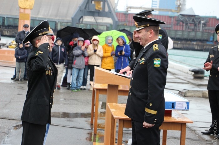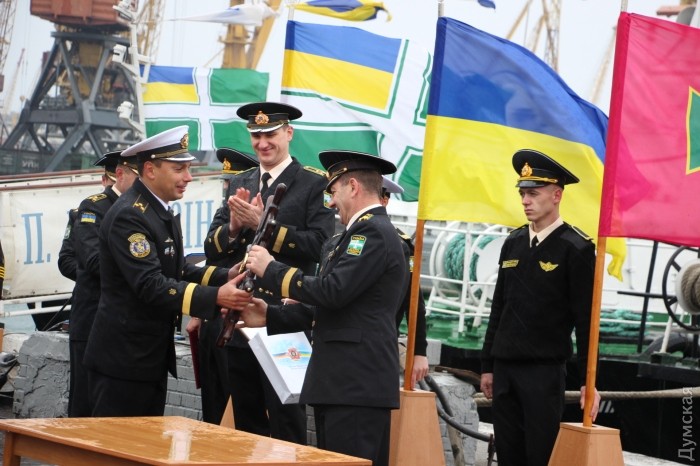 Временно установленный стенд памяти погибших в АТО заменили на стационарную мраморную доску памяти. К ней пограничники и приглашенные на праздник школьники подшефных школ, ученики морского лицея, волонтеры и шефы, которые опекают подразделения Одесского отряда морской охраны, ветераны отряда и члены семей военнослужащих части возложили цветы.