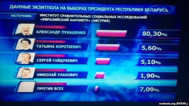 На втором месте с 5,6% Татьяна Короткевич, на третьем месте Сергей Гайдукевич — 5,1%, на четвертом и последнем месте Николай Улахович — 1,9%. Против всех проголосовали 7,1% опрошенных избирателей. Всего было опрошено 11, 896 тысячи избирателей на 303 участках по стране.