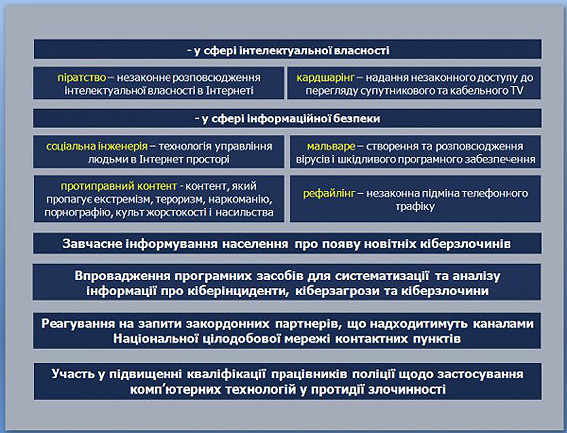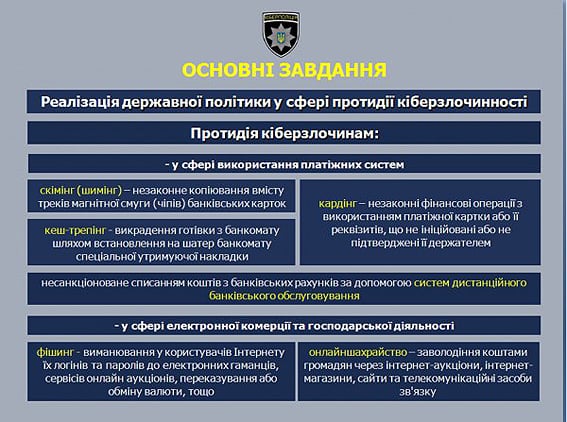 Основными задачами киберполиции станут реализация государственной политики в сфере противодействия киберпреступности, предотвращение киберпреступлений, в частности – в сфере использования платежных систем, электронной коммерции и хозяйственной деятельности, а также интеллектуальной собственности и информационной безопасности.